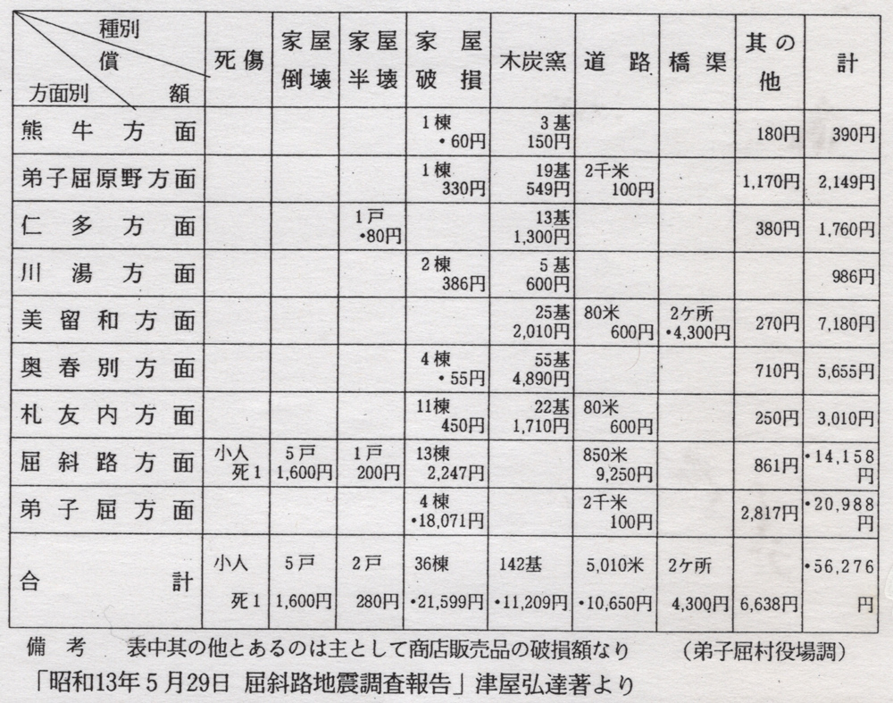 また「昭和十三年五月二十九日屈斜路地震調査報告(昭和十三年六月二十一日地震研究所談話会発表) 津屋弘達著では弟子屈村の被害状況を弟子屈村役場調として右表のように発表しています。